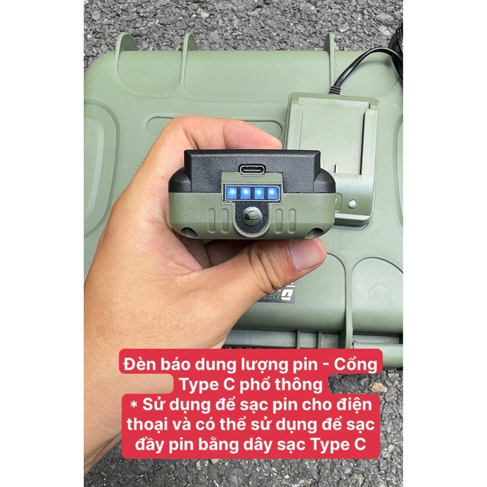 - Cổng sạc Type-C: Cho phép sạc trực tiếp trên pin mà không cần đế sạc cồng kềnh. Đặc biệt, tính năng sạc ngược (có thể dùng pin máy laser để sạc điện thoại trong trường hợp khẩn cấp) là một giải pháp kỹ thuật rất tiện lợi cho thợ công trình.