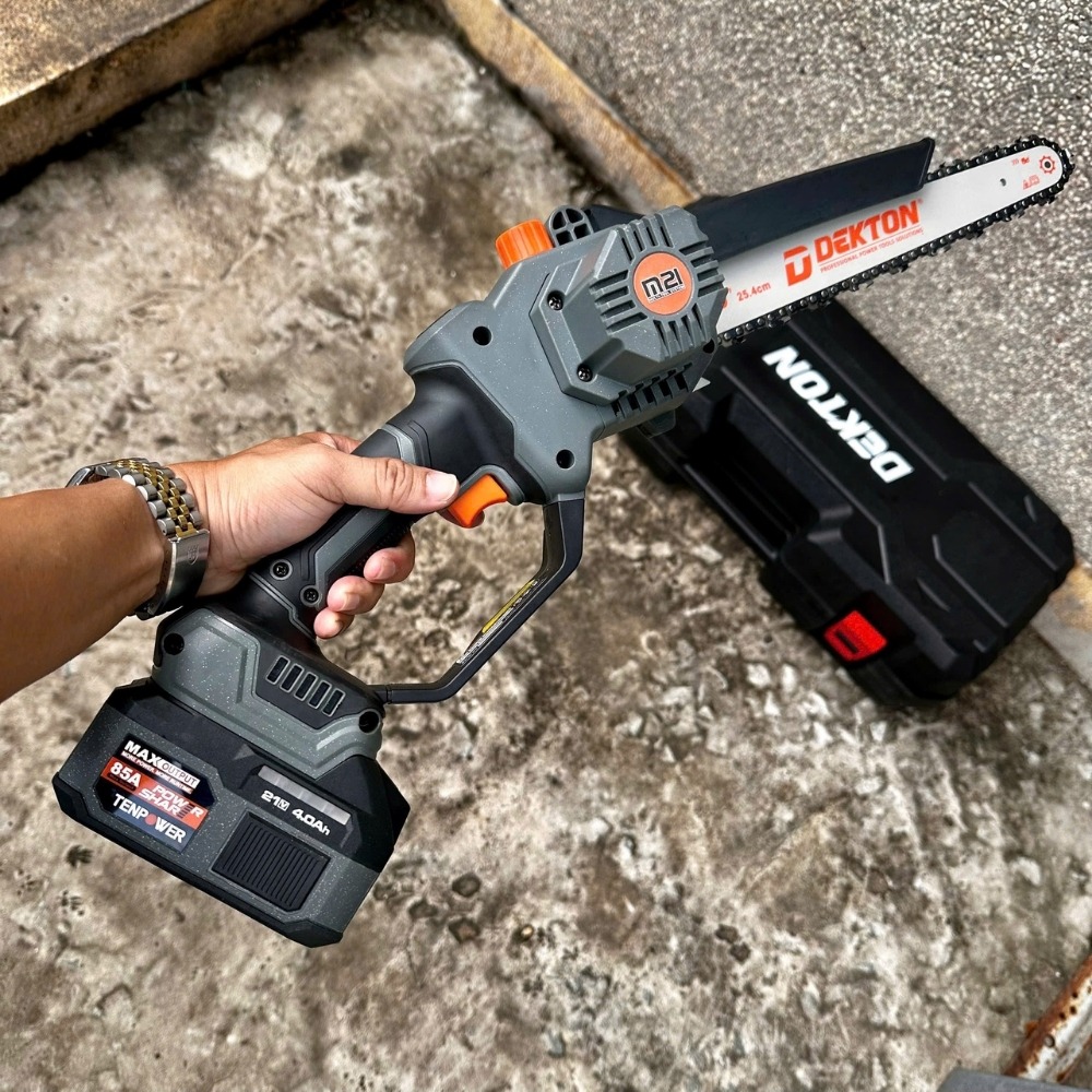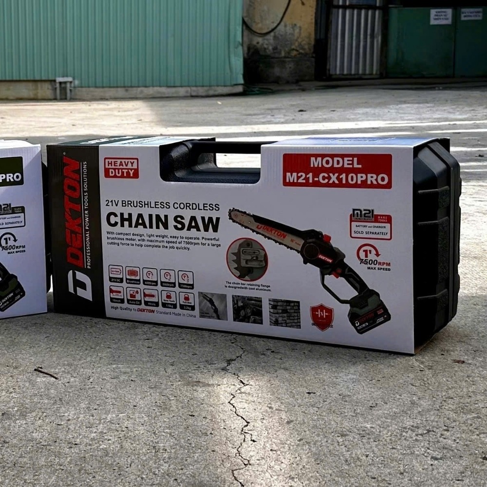 - Yêu cầu về Pin: Để đạt tốc độ 10m/s và vòng tua 7.500 RPM, máy tiêu thụ dòng xả cao. Bắt buộc sử dụng pin M21 Plus từ 4.0Ah trở lên. Pin dung lượng thấp sẽ khiến máy dễ bị ngắt mạch khi lưỡi xích ngập sâu vào thân gỗ.