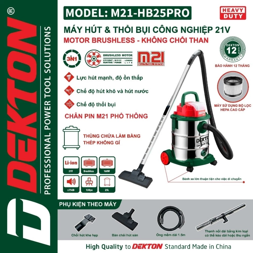 - Yêu cầu nguồn Pin: Với bình chứa 25 lít, người dùng thường có xu hướng sử dụng máy trong thời gian dài. Bắt buộc sử dụng pin M21 Plus từ 6.0Ah trở lên. Pin dung lượng thấp sẽ nhanh chóng cạn kiệt do công suất duy trì lực hút 13Kpa trên thể tích thùng lớn là khá đáng kể.