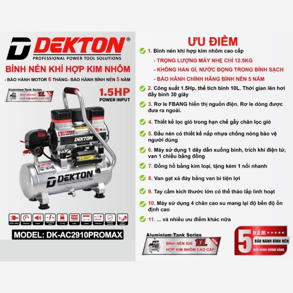 - Bình nén hợp kim nhôm: Đây là ưu điểm lớn nhất. Nhôm giúp máy nhẹ hơn bình thép, tản nhiệt nhanh và đặc biệt là không bị rỉ sét từ bên trong. Vì vậy, chất lượng khí nén cực kỳ sạch, phù hợp cho y tế, thực phẩm và điện tử. Hãng bảo hành bình hơi lên đến 5 năm.