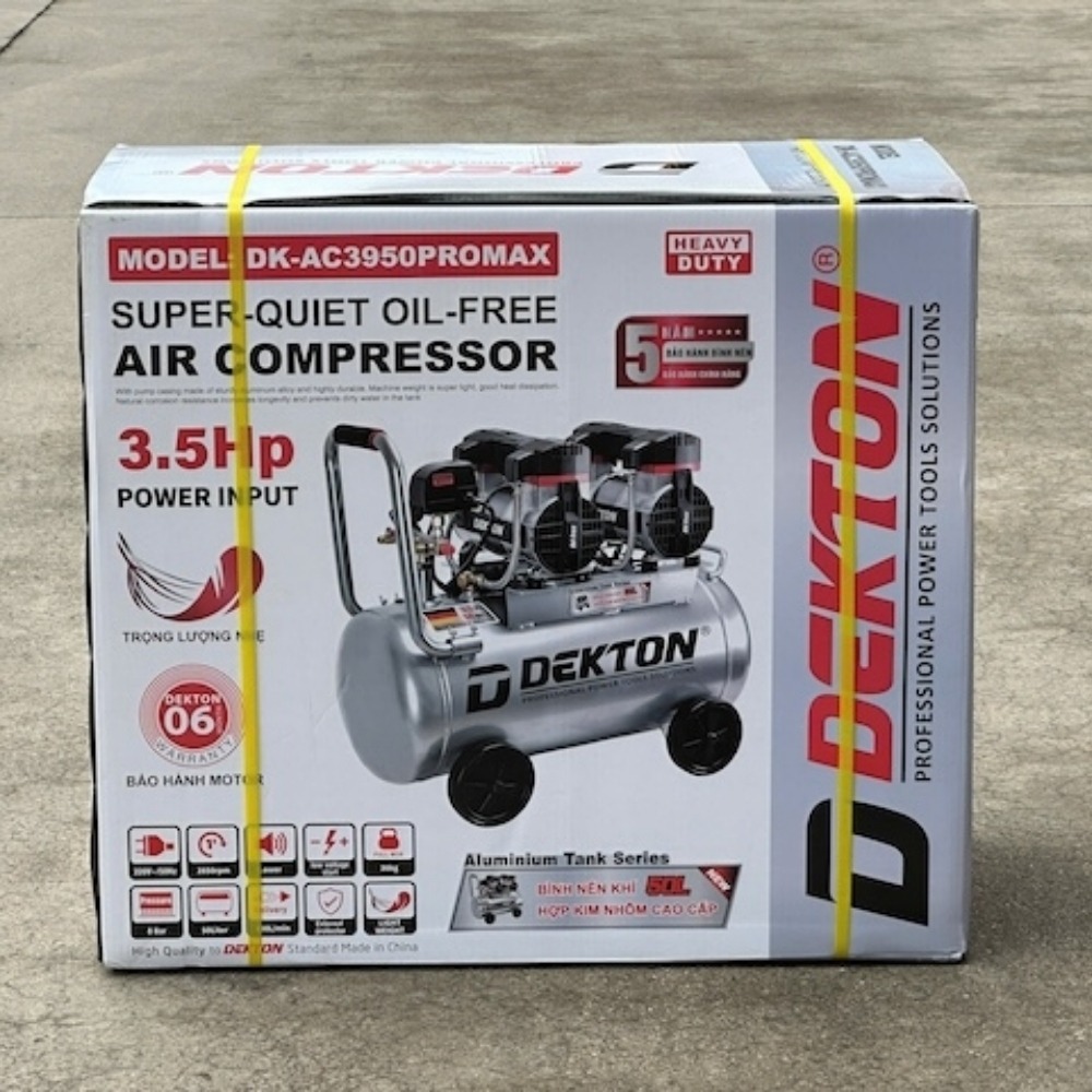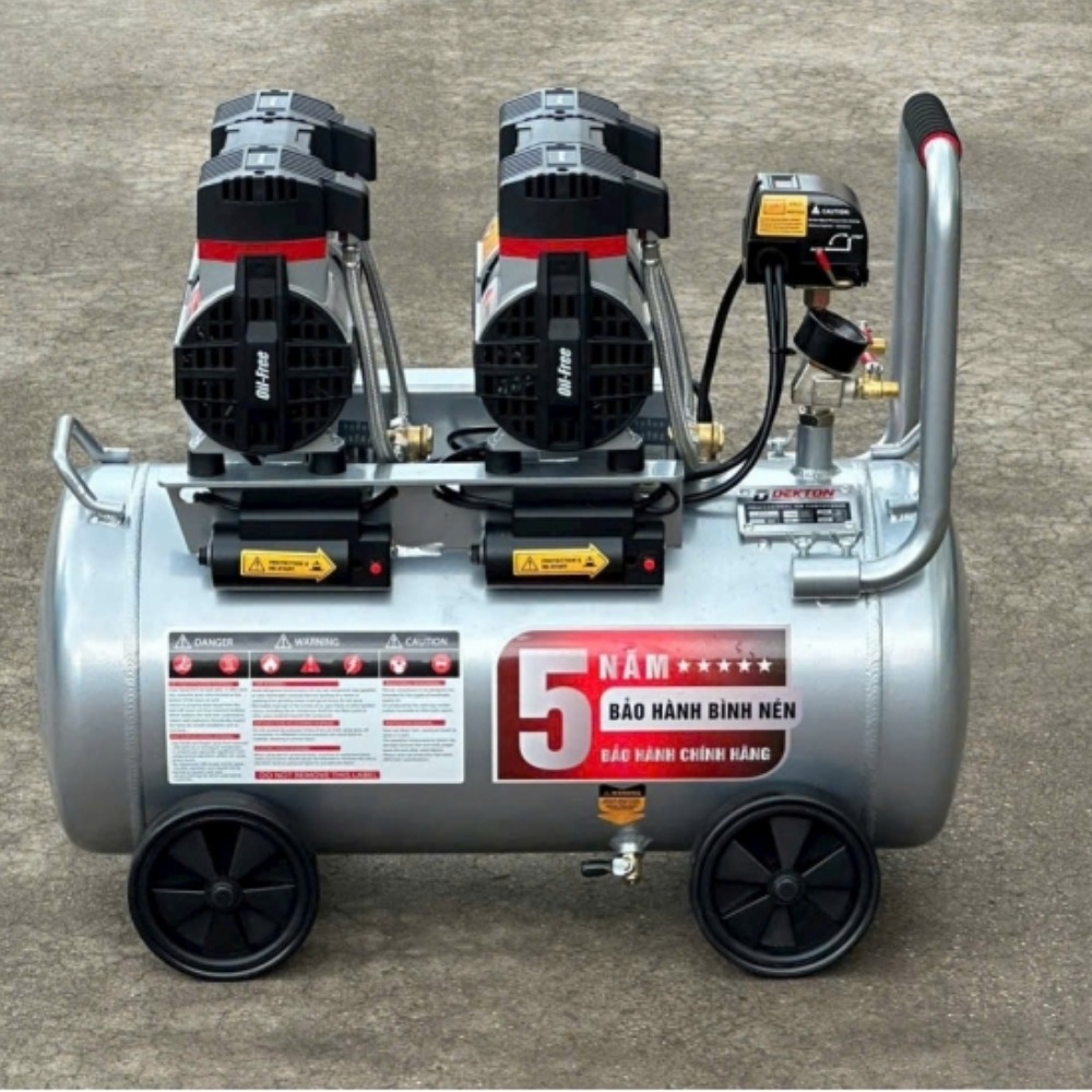 - Lưu lượng đạt 400 lít/phút, thời gian nén đầy bình 50L chỉ mất 42 giây. Đây là cấu hình mạnh nhất cho dòng máy không dầu xách tay.