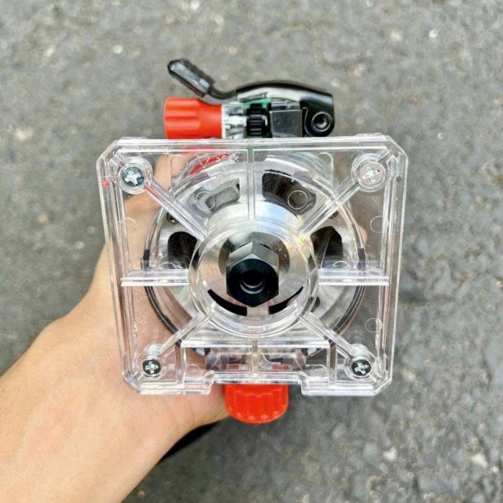 - Đế nhựa trong suốt giúp người thợ quan sát rõ đường đi của mũi phay, đảm bảo độ chính xác khi soi theo đường vẽ.