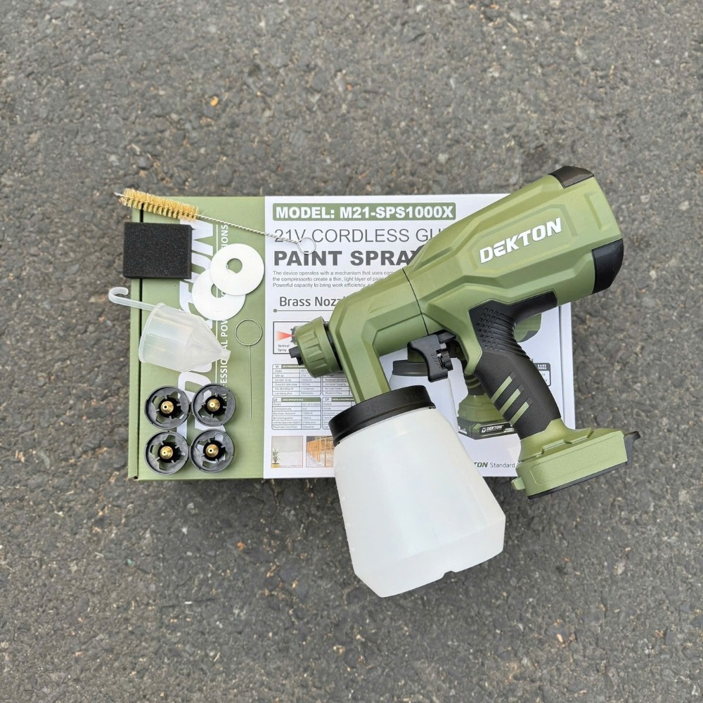- Bình chứa 1.000 ml: Dung tích 1 lít tạo sự cân bằng giữa thời gian phun và trọng lượng tay cầm. Khi nạp đầy sơn và lắp pin 4.0Ah, máy vẫn đảm bảo tính linh hoạt khi thao tác ở các vị trí khó như gầm bàn hoặc trên cao.