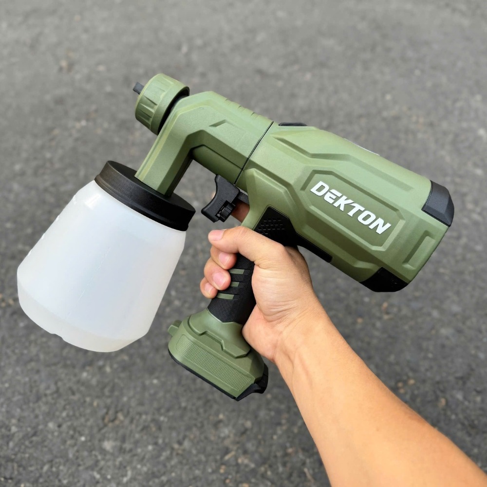 - Hiệu suất Động cơ: Với tốc độ motor 37.000 vòng/phút, máy tạo ra luồng khí mạnh giúp xé tơi hạt sơn ngay tại đầu bec. Lưu lượng 900 ml/phút đảm bảo khả năng phủ kín bề mặt nhanh, tiết kiệm thời gian thi công so với quét cọ truyền thống.