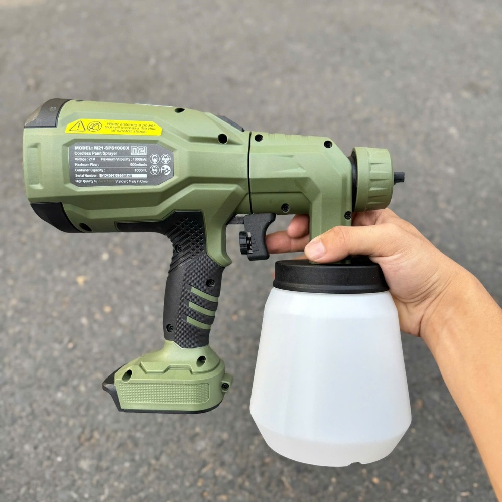 - Lựa chọn Pin: Khuyến nghị sử dụng pin M21 Plus dung lượng 4.0Ah trở lên. Motor tốc độ cao yêu cầu dòng xả ổn định để duy trì áp suất hơi, tránh hiện tượng tia sơn bị yếu dần khi pin gần hết.